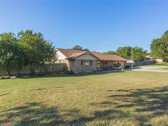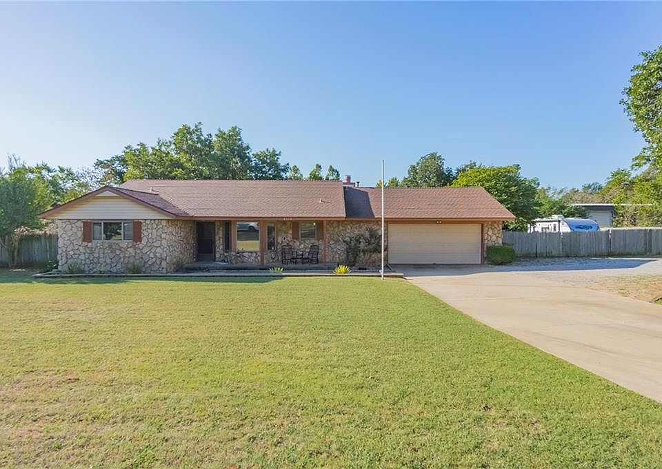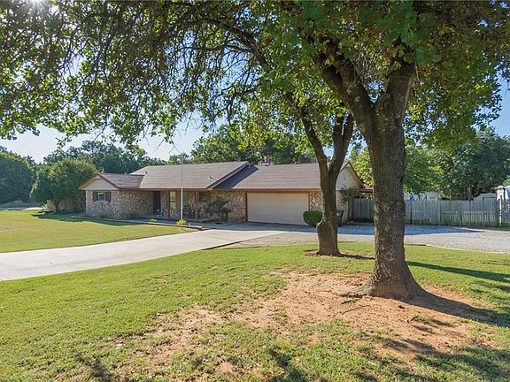 Well maintained 3bed/2bath home in fantastic location! Great opportunity to own a house with land on the North side of Edmond. 3/4 acre (mol) landscaped lot with mature trees. Fenced and gated back yard with storage building and workshop with power. Covered front and back patios. Circle drive in front for additional parking. Sellers have loved this house well! Stained and etched concrete floors through the entry and kitchen/dining. Kitchen has solid surface countertops and extensive cabinetry. Large living room with vaulted ceiling accented by floor to ceiling stone wood-burning fireplace and built-in bookshelves. Updated guest bathroom with new countertops and fresh paint. Good sized rooms and comfortable layout. Private master bedroom suite with dual sinks and full bathroom.