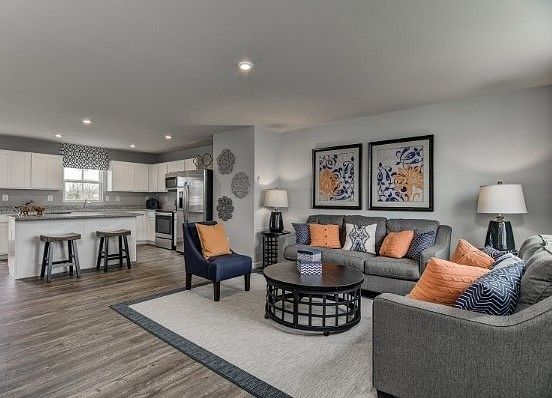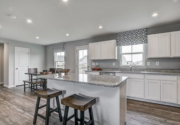 The main level offers an open floor plan with a spacious living room, dining area, and a large kitchen featuring granite countertops, custom tile backsplash, stainless steel appliances, and an island with seating. A flex room off the entry makes the perfect home office or playroom. You’ll also find a guest powder room, large pantry, and laminate flooring throughout the main living areas.