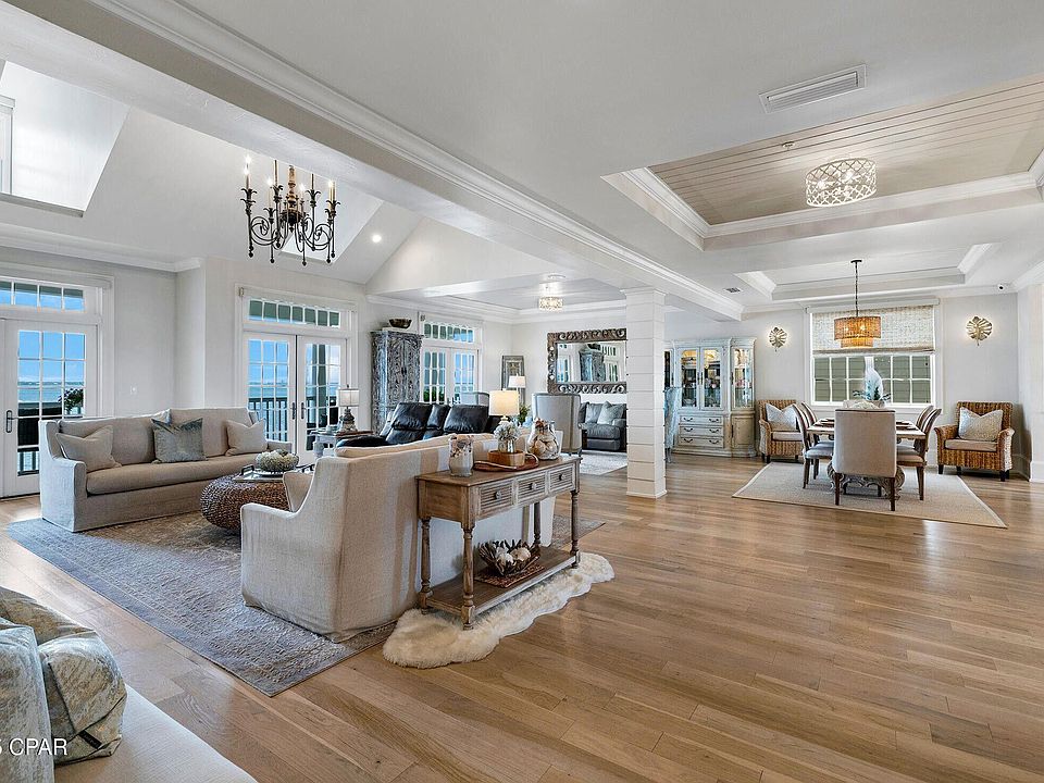 From sunrise coffees on your private master balcony to sunset soirees on the spacious wraparound decks, every moment here is curated for luxury and leisure. The grand foyer impresses with a winding staircase and elevator, leading to a bonus en suite ideal for multi-generational living or a private guest retreat. Soaring ceilings, custom crown molding, tongue-and-groove accents, Hardy board details, and new skylights bathe the interior in natural light. Recent high-end upgrades include oak floors, paint, ceilings, a tankless water heater, and three new HVAC systems (2020). Residents enjoy access to resort-style amenities: a bayfront pool, outdoor kitchen, clubhouse with theater, fitness center, event space, and an extended dock perfect for fishing or relaxing. This is a rare opportunity to own a true hidden gem in one of Panama City Beach's most treasured communities offering the lifestyle you deserve, with the views to match.