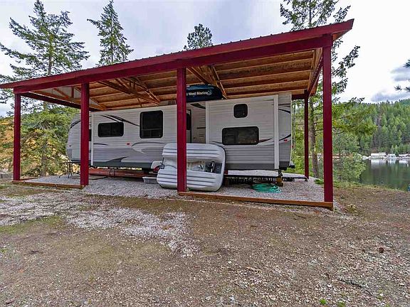 Quiet end-of-the-road property. Lake front has a beautiful retaining wall and steps. After enjoying 50' of water front, hang your wet towels on the privacy fene. Gentle slope makes it easy to walk from "home" down to the lake. Land has ample parking or large play area for the kids behind the "home". No worries with heavy snow, the barn-like structure over the 2013 Jayco Jay Flight has a snow load of 40#. Large trees were removed, so all you need to do is sit back and enjoy the scenery.