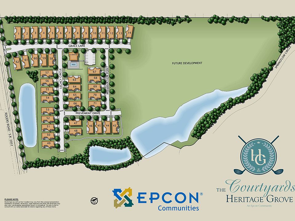 The Courtyards at Heritage Grove will feature 83 beautifully designed ranch-style homes in a maintenance-free Epcon Community in Wake Forest, North Carolina. Our open, light-filled homes have been designed to make living more comfortable, with flexible and spacious living areas and luxury features throughout. Enjoy the convenience of complete single level living or expand your living space with a 2nd floor bonus suite! We are designing The Courtyards at Heritage Grove to be a private retreat, surrounded by today's modern conveniences. The community centerpiece for social, recreational and fitness activity, the clubhouse will offer resort-style amenities, just a few steps from the front door of your new home. Walking paths will lead you to scenic green space and picturesque ponds to be enjoyed throughout the community. Maintenance-free living means you can enjoy the benefit of owning a home without the perpetual stresses of exterior maintenance. Homeowners can relax and live a life of leisure knowing a professional association is handling all of their home's exterior upkeep including yard work and landscaping.