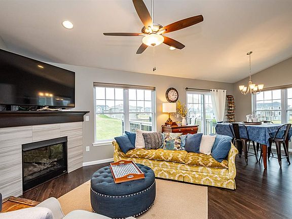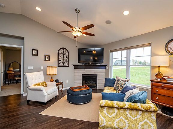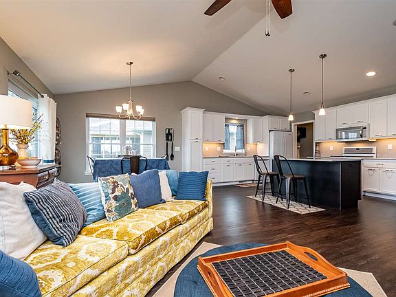 Beautifully upgraded zero-entry ranch w/ one-level living plus walk-out basement. Welcoming open-concept living room has vaulted ceilings, gas fireplace, and audio sound system with speakers inside & on deck. Bright, spacious kitchen with white cabinets, pantry, quartz counters & Maytag appliances. Great mudroom has bench & cubbies & washer/dryer. Generous primary bedroom with trey ceiling detail includes large walk-in closet & ensuite bathroom with dual sinks. Walkout basement includes 2 large bedrooms.