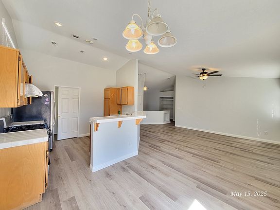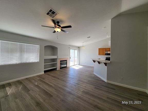 This charming single-story residence features 3 spacious bedrooms, 2 full bathrooms, and a bright, open-concept living area perfect for relaxing or entertaining. Step inside to find updated wood-look flooring throughout the main living areas, fresh neutral paint, and ample natural light. The spacious living room includes built-in shelving and a cozy gas fireplace. The adjacent kitchen boasts tile countertops, solid wood cabinets, a breakfast bar, and modern stainless steel appliances, including a gas range. Enjoy the comfort of ceiling fans in both the living and dining areas, and the convenience of a sliding glass door leading to your private backyard space. The front yard is beautifully landscaped with low-maintenance desert rock, while the attached 2-car garage provides plenty of storage and parking.