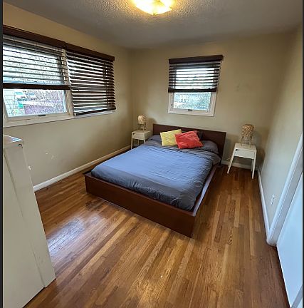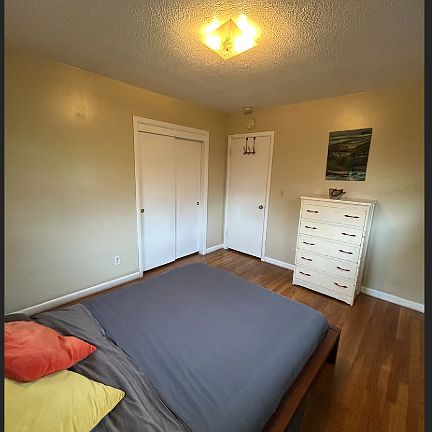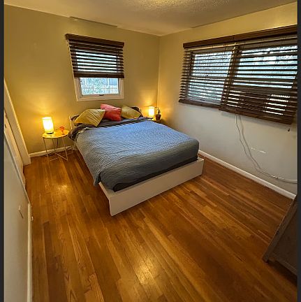 Beautiful inviting 2 bedroom plus office, 1200 sq ft mid century modern home. Located in a fabulous neighborhood, with easy access to public transportation to local hospitals. Open living room/dining room, large picture windows for plenty of natural light, working fireplace with 1 free bundle of wood, large smart TV, dining room table seats 4. Fun retro style fully equipped kitchen with new large stainless steel fridge, new gas stove/oven, kitchen table seats 4, pocket door. Plus complimentary local coffee. 2 spacious bedrooms with queen beds, dresser, large closets. 1 office with desk, built-in shelves, large closet and basic storage spaces. Clean spacious bathroom with tub/shower, plenty of counter-space, and drawer space. Access to a fenced large shared backyard for an approved friendly dog. Owner pays for all Utilities. 1-3 Month Lease