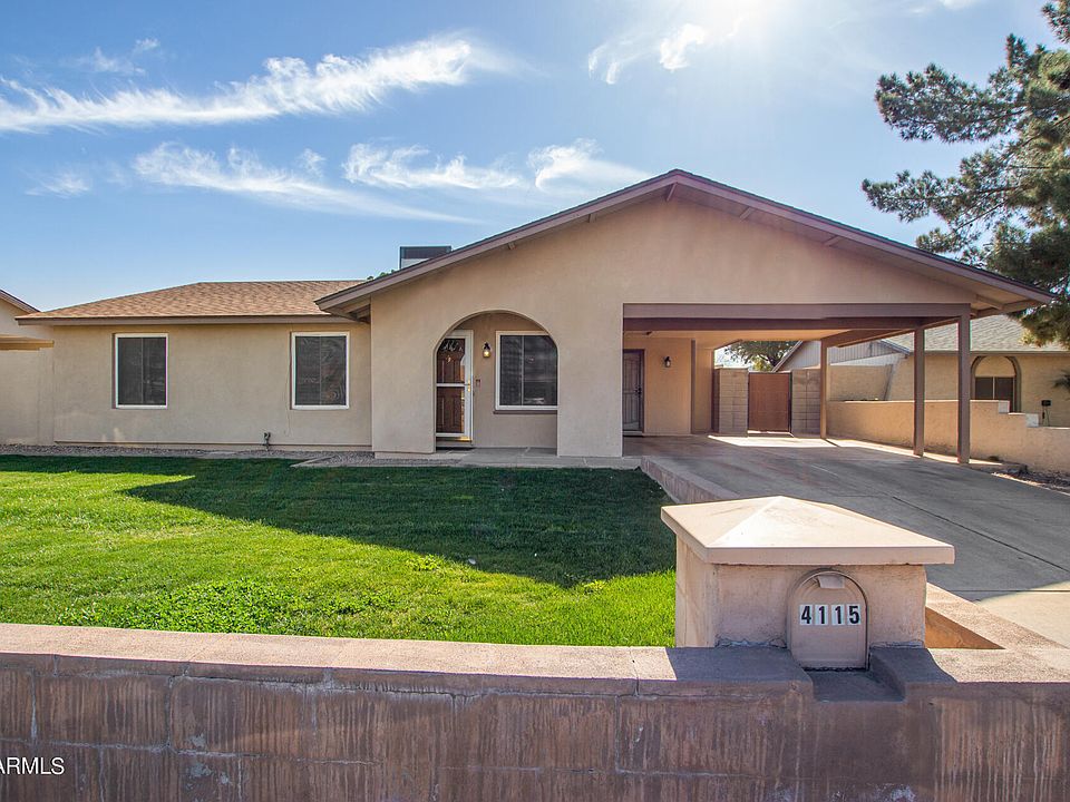 Welcome to this charming 4-bed, 2 bath home in popular Phoenix! Featuring a gorgeous green grass front yard, ample carport space, and extended length driveway. Discover a welcoming living room greeting you upon entry. It flows into the eat-in kitchen with convenient access to the back covered patio great for entertaining. Slate stainless steel appliances, granite counters, wood cabinets with crown moulding, and and an island with breakfast bar complete the kitchen space. Most of the bedrooms have plantation shutters, and carpet flooring. Primary bedroom with sliding mirrored closet space, and en suite for your convenience. Outback, the large grass yard offer plenty of space to run around, pets or young ones to play. Don't miss out on this gem!