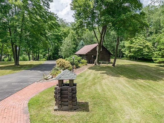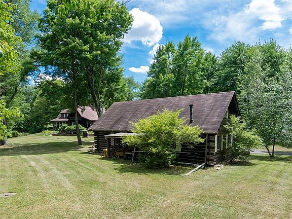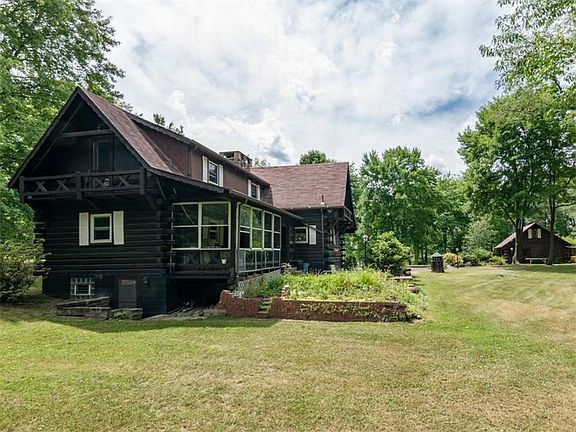 This charming two story log home isn't just rustic-chic, it's also extremely well built. Sitting on just under two acres of level land, it is walking distance from many of the business along Route 8. While it's close to all that you'd need for your everyday needs, it's situated so that you feel as if you aren't near anybody. The large eat-in kitchen has plenty of counter space, lots of solid wood cabinetry for storage as well as a bricked-in cook-top and double oven. The master bedroom has an en suite bathroom and is located on the main living level of the home. The family room is big enough to offer plenty of seating options and is centered upon a beautiful stone fireplace. Upstairs you'll find two bedrooms, each of which have balconies, allowing for views of the surrounding woods. There is also a second full bath upstairs. Along with the balconies on the second floor, there is a grand front porch with a porch swing as well as a large screened-in side porch. The detached two car garage is big enough to park two cars and still have a work area. The second level in the garage features plenty of options for storage. The unfinished basement currently has a large game room area with a pool table and second fireplace. Another large room in the basement could easily become a home office. The laundry area and work area of the basement allows for outside access and has a half bath.