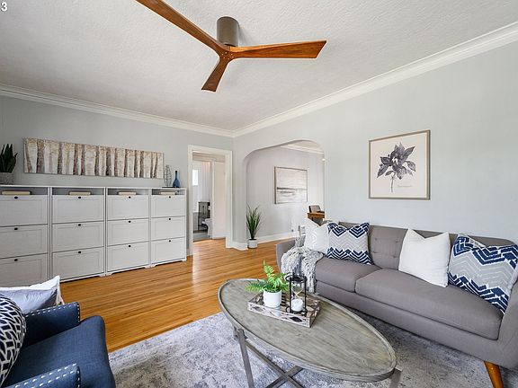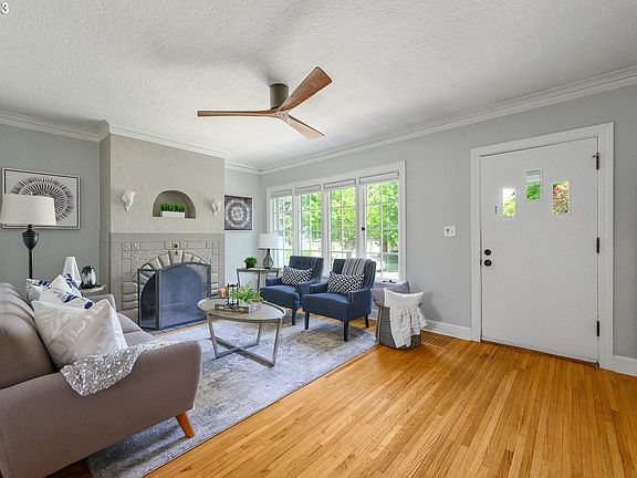 This beautiful 1929 Bungalow in sought-after Roseway neighborhood is totally swoon-worthy! Step inside and be greeted by original oak floors that exude warmth and character. Formal living room has large east-facing windows and a wood-burning fireplace to cozy up to. Formal dining room has leaded-glass built-ins and French doors leading out to the epic backyard. The kitchen has been thoughtfully updated, with new appliances, butcher-block counters, and ample cabinetry and storage, creating a perfect space for culinary enthusiasts. The bathroom is beautifully detailed with subway tile, modern finishes and a relaxing, deep soaking tub. Versatile layout with two generous main floor bedrooms plus a big primary bedroom and 4th smaller bedroom upstairs (home office, nursery, epic dressing room?). The spacious full height basement provides ample storage space and the potential for additional living areas or a workshop, allowing you to customize it to your needs and preferences. Enjoy the tranquility of a park-like backyard, where you can unwind, host outdoor gatherings, or indulge in gardening projects. The lush greenery provides a peaceful retreat from the hustle and bustle of the city. It has established apple, peach, sour cherry, black raspberry, and gooseberry plants as well as 4 giant Douglas fir trees that cover the yard in afternoon shade. One car garage has really tall ceilings, a pit (if you're handy like that) and has a new 6kW EV car charger. Newer roof, high-efficiency windows and water heater in 2020, new 200A electrical panel, radon mitigation system and much more! Don't let the furnace fool you. It's gas and has a newer system inside the cool vintage shell. Picturesque Portland neighborhood is walking distance to many great eateries like Cameo Cafe, Upright Brewing and Fresh Love. 1/2 mile from Sacajawea off-leash dog park and so much more! [Home Energy Score = 1. HES Report at https://rpt.greenbuildingregistry.com/hes/OR10221997]
