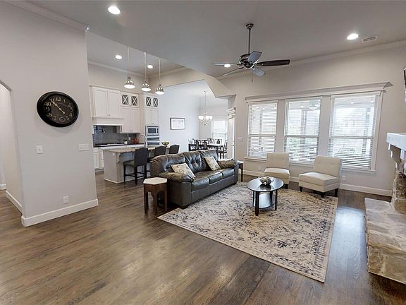 Large lot with plenty of room for outdoor living! Back yard features enclosed patio and fire pit overlooking a large pond w/ fountain. Kitchen opens to living area/fireplace and wood floors throughout. Master Suite incl. his/her walk-in closets w/ built-ins & access to laundry room from master bath. Family entertaining upstairs with dry bar in large family room, bonus game room, 4th bedroom/bath overlooking pond/fountain. Walking trails & mature landscaping in gorgeous neighborhood!