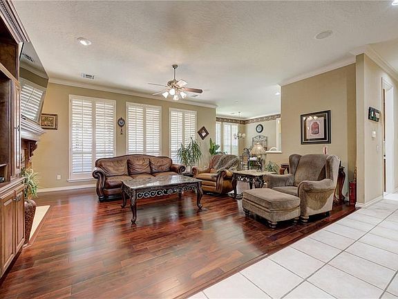 Beautiful, well maintained home in Warwick situated on a spacious corner lot with a side entry 3 car garage and a large backyard! Offering a flexible floor plan with 3 bedrooms, a study, and an upstairs bonus space, or 4 bedrooms. The study and the bonus rooms both have a closet and either would make a great extra bedroom. Featuring hardwood floors in the living room, dining room, study, and one of the bedrooms, plantation shutters throughout, floor safe, new dishwasher, new roof/gutters/garage doors/study window in 2021. The family room and study both have built ins and the primary suite offers a large en suite bath and walk in closet and has access to the patio. Built in speakers for patio, master, living room, and study. Newly constructed pantry offers extra storage!Warwick has a nice community pool and is perfectly located near the Healthplex and easy access to I-35, great schools, restaurants, and shopping! The seller will provide a $2000 carpet allowance with an acceptable offer.