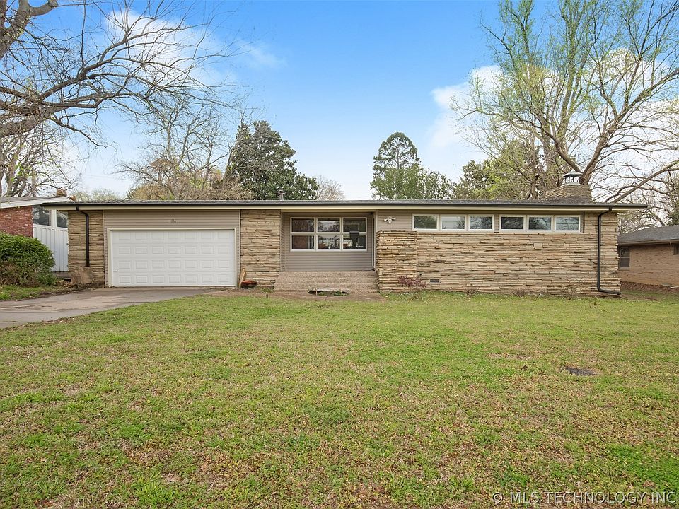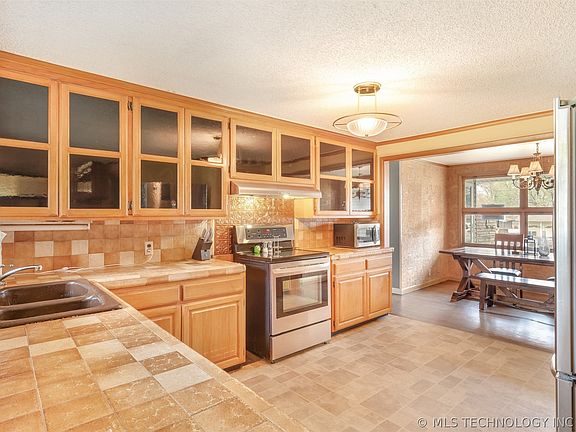 Cool & funky retro style home that's priced to sell!. Sunken living room w/vaulted ceiling & stone wall. Formal dining w/cork metalic walls opens to kitchen. Large kitchen w/eat in area. Coolest retro bath ever! Indoor utility. Large backyard w/deck!