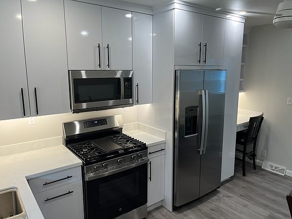 Newly renovated house which includes freshly painted walls new kitchen appliances and cabinets , living room has new built in cabinet, new vinyl floors thru-out the house as well as updated bathrooms.