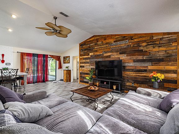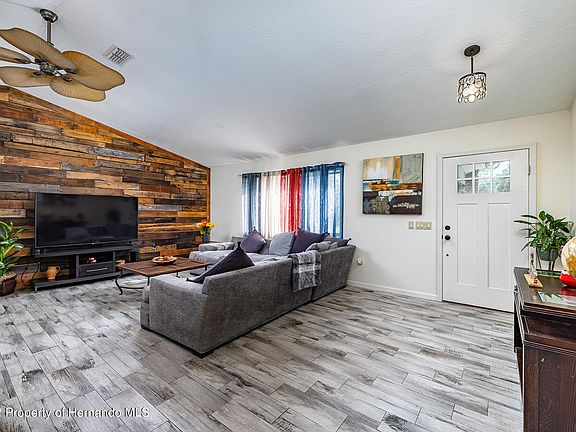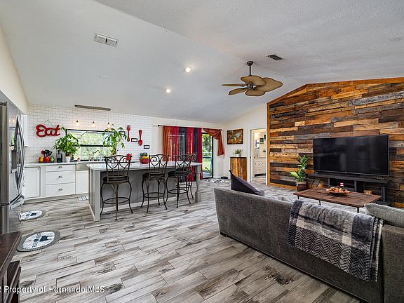 This is the one you've been waiting for! Don't miss this gorgeous 2-bed/2-bath/2-car garage home filled w/updates galore on a giant 1/2 acre lot and no rear or left side neighbors. Enter the home into the main living area featuring an open floor plan. Weathered wood look plank tile floors run throughout the entire home. Main living area features a custom wood accent wall and skylight. Gourmet kitchen w/island and barstool seating, quartz countertops, subway tile backsplash, stainless steel appliances, range hood w/custom tile backsplash and farmhouse sink. There is also room for a breakfast table. This home has a split floor plan design w/the master on one side w/access to the pool and a sizeable walk-in closet. The master bath has been completely remodeled and features a step-in shower w/custom tile, new vanity w/stone countertop, custom mirror and light fixture. On the opposite end of the home is the second generously sized bedroom w/tons of closet space. Just outside the bedroom door is the second bath that's been beautifully updated w/custom tile in the shower/tub, new vanity w/stone countertop, new toilet, and new mirror and light fixture. This bathroom also serves as the pool bath as there is an access door out to the pool just outside the bathroom. This home has a great outdoor space. Take a dip in your own swimming pool w/screened enclosure and new pool equipment in 2019. There is plenty of covered seating area to enjoy being out of the sun. The entire huge backyard is fenced and there is also a fire pit, gazebo and storage shed for your lawn equipment. This home also has a unique storage room built-in to the front right of the home accessed from the outside for extra storage space or home workshop and an interior laundry room. The home also features additional parking spaces ideal for boat/RV parking. Major items include BRAND NEW ROOF (2022), New AC (2018), septic serviced/pumped (2019), new water heater (2018), new garage door/opener (2018). Home is in a great location near shops, restaurants, schools, YMCA and the Suncoast Parkway.