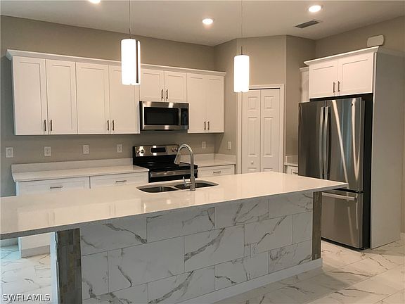 Buyers financing fell thru!! Highly Motivated Seller! Welcome to your dream home in Lehigh Acres! This stunning single-family home boasts 3 bedrooms, 2 bathrooms, and a spacious 2-car garage. The modern kitchen features elegant Quartz counters, stainless steel appliances, and sleek tile flooring, Upgraded lighting throughout the home creates a warm and inviting atmosphere, Main bedroom offers Two walk-in closets, Main bath includes double sinks, luxurious tile shower with a glass door is perfect for unwinding after a long day, Guest bath offers beautiful tiled shower w/ Bathtub combo. The epoxy garage floor and laundry sink add convenience and functionality to this beautiful home. Outside, a large concrete pad extends around the home, providing ample space for outdoor BBQ and storage area. Lanai provides space for entertaining or relaxing in the Florida sun. With impact windows and doors, you can rest easy knowing your home is protected during storm season. Conveniently located near shopping, hospitals, restaurants, and the SW Fl Regional Airport, this home offers the perfect blend of comfort and convenience. Don't miss your chance to own this brand new construction home in a prime location, on a dead-end street, with limited traffic.