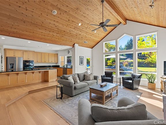 fireplace, and floor to ceiling windows with views into the backyard. The kitchen features a gas cook-top,