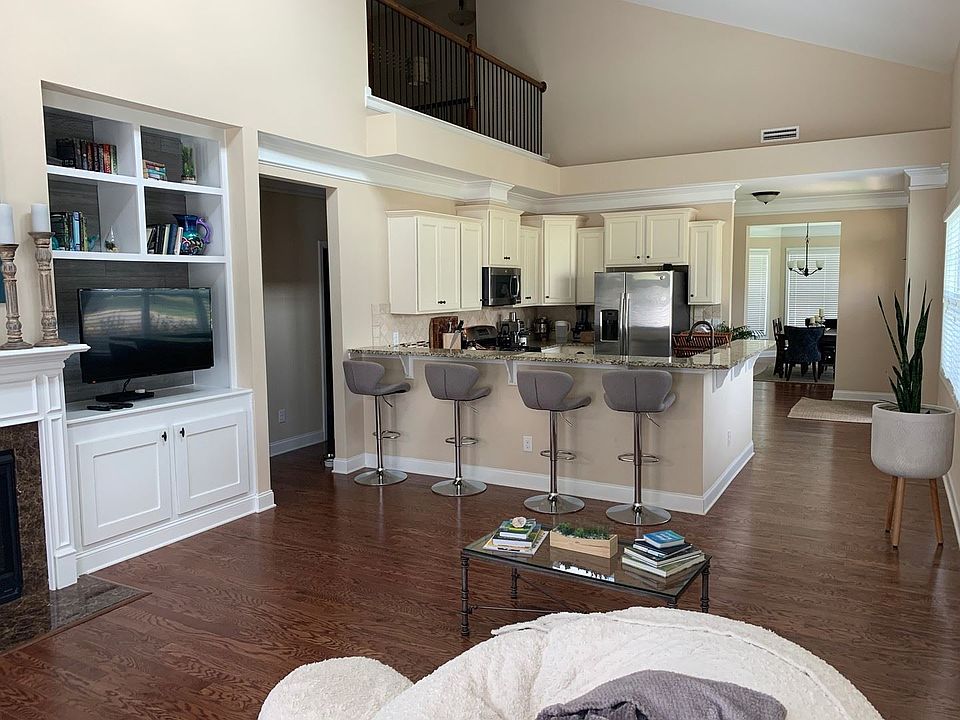 Lovely End Unit Townhome located in the Vineyards on Lake Wylie Subdivision! - This very spacious corner lot with adjoining common area lawn includes 3 bedrooms and 2.5 baths. This home also features a beautiful kitchen with granite countertops, stainless steel appliances and a breakfast bar, open floor plan, hardwood flooring in the main area, gas fireplace in the great room, 2 car garage, neutral paint colors throughout, spacious open loft on the second level, master bedroom includes a walk-in closet along with dual sinks, granite and a garden tub. Fenced in yard with a patio. This townhome is a must see! Washer and Dryer included. Easy access to the City and Airport. Resort Style Community. No Cats Allowed (RLNE5081122)