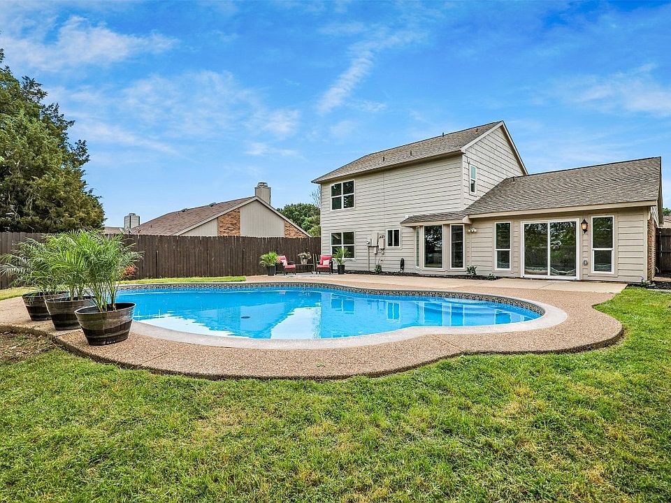 Multiple offers received! FANTASTIC COMPLETELY REMODELED 3 bedroom 2.5 bath home with POOL! Home is light and bright with new windows, modern vinyl plank flooring, and designer light fixtures! Gorgeous kitchen with white cabinets, granite, stainless steel appliances, prep island, and custom backsplash. Secondary living area with electric fireplace and new sliding glass doors overlooking the pool. Upstairs features large primary bedroom with a gorgeous updated ensuite, including large walk-in shower with seamless shower doors, large vanity with granite countertops. Two secondary bedrooms upstairs with beautiful updated bath. Large backyard with sparkling pool, storage shed, and extended cement patio. This perfect for entertaining and won't last long. Keller ISD!!