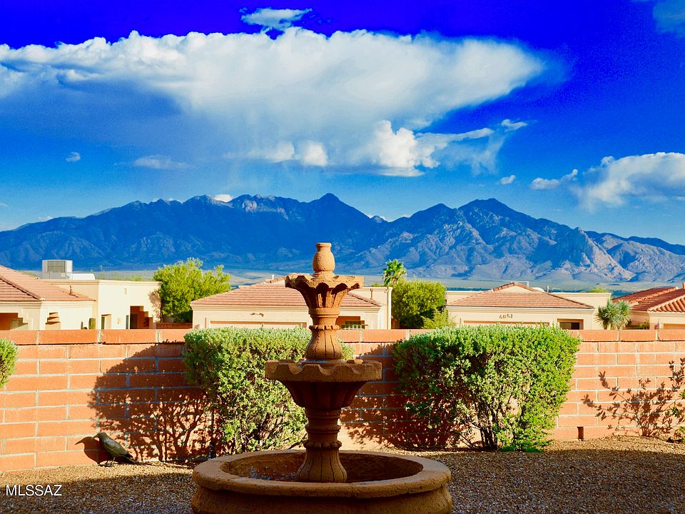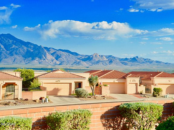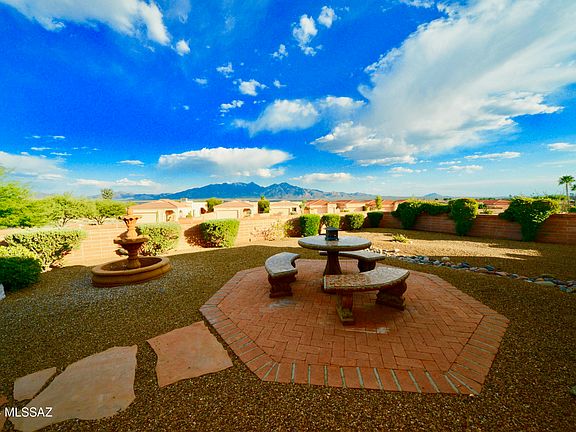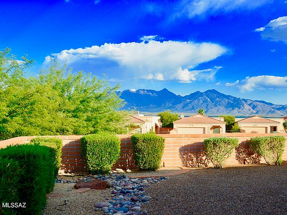 Welcome to your dream home in San Ignacio Ridge Estates! Perched on a premium corner lot, this meticulously maintained 1,790 sq ft home offers stunning panoramic views of the Santa Rita's! Whether enjoying morning coffee or evening drinks, relax on the private flagstone patio, and take in the breathtaking, ever changing, panoramic Mountain views. Inside, find two spacious primary suites, plantation shutters, and tile in all the right places. The front room w/ gas fireplace is perfect for entertaining, while the back living room offers casual elegance. The modern kitchen features ample counter space, custom knotty Alder cabinets & gas stove. Enjoy ample storage throughout plus a large garage with bonus workshop or storage room. New roof ('14), water heater ('20), and replumbed ('21)