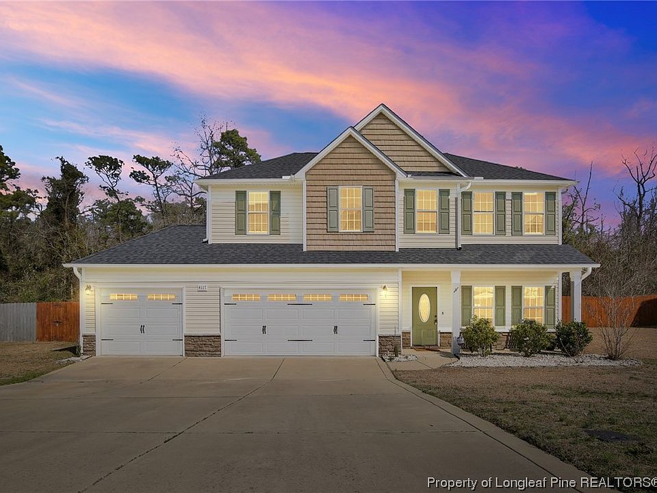 Fantastic four bedroom house on over two acres in the Jack Britt School District of Fayetteville! Home features a large three car garage, open floor plan, large loft, and custom outdoor fireplace. The main level provides an office, half bathroom, great room, dining area, and kitchen with upgraded light fixtures. The second level offers loft, three guest rooms and full hall bathroom, and large primary bedroom with ensuite bathroom. Back yard features screened in porch, fence, and epic tree house.