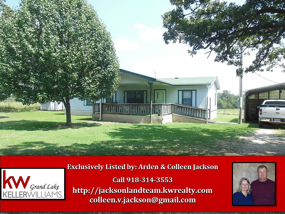 Handicapped Accessible 3 BR, 2 BA Manufactured Home (1994) on 8 more or less acres. Very spacious home! Windows, floor and extras were updated in 2009. The front porch and shade trees are a delight. MB with large MBath. 5 ton Newer heat pump/energy efficient. The land is fenced-has goats on it now, nice pond, barn with stalls for the goats, Close to Lake Eucha & .3 m of Hwy. 20.