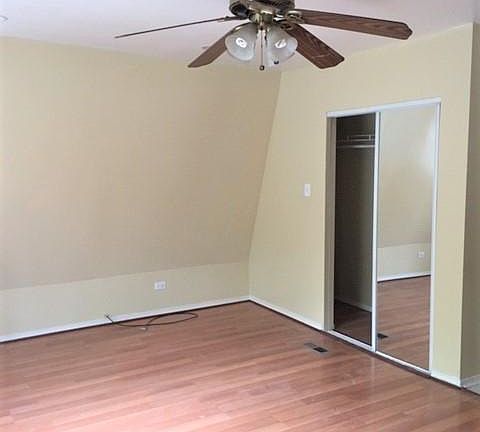 Ceiling fanHardwood floorsHallway walk in closetsMirrored closet
