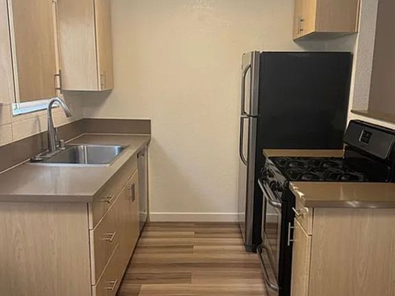 Open kitchenHallway cabinetsKeyless gated entryStainless steel refrigeratorGas stove