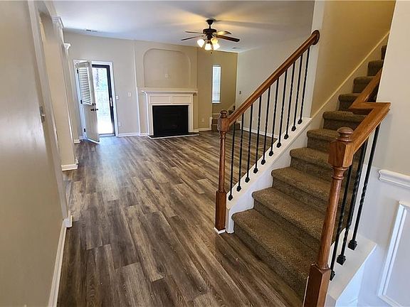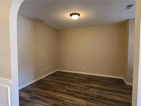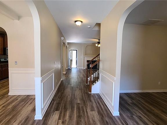 Welcome home to this brick front beauty with rocking chair front porch! This true traditional charmer has a welcoming foyer with living/flex room on one side and separate dining room with arched entry, rich coffered ceiling on the opposite side. Back of the home has bright kitchen with wood cabinets, granite countertops, gas range, built-in microwave, breakfast bar, eat-in area, pantry and is completely open to the spacious family room with gas starter fireplace. Guest bedroom with full bath and laundry room finishes the main level. Front and rear stairs to second level. Upstairs primary suite has tray ceiling, separate sitting area, huge walk-in closet with window, double sink vanity with knee space, garden tub and separate tiled shower with frameless glass door. A true split plan with secondary bedrooms on the opposite side of home are spacious have ample closets and share a full bath, separate wet area and linen closet. Great outdoor space includes patio and nice fenced backyard.