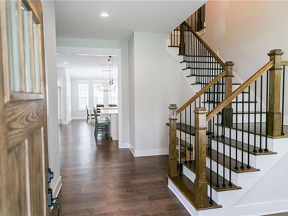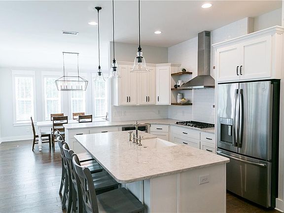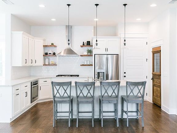 Custom home in Parkerson's Mill. From the floorplan and finishes to the expansive lot, each aspect of this property is stunning. Every room is flooded with natural light from an abundance of windows. Fresh landscaping and a pop of color on the exterior set the tone for the delightful interiors. The open foyer features a functional built-in drop zone. The design elements in the open kitchen and living space are numerous: Pelican White quarts counters, bridge faucet, farmhouse sink, antique pantry door, gas range, white cabinets, SS appliances, natural wood open shelving, gas fireplace, built-ins flanking the fireplace. The spacious dining room is surrounded by three walls of windows. The main level guest suite features stamped tiles and a frameless shower. 14' ceilings set the tone for the tremendous master suite w/ windows spanning the height of the room, custom closet w/ barn door, & bath with freestanding tub, pebble-floor shower, quartz counters, & high-end fixtures. (Continued...)