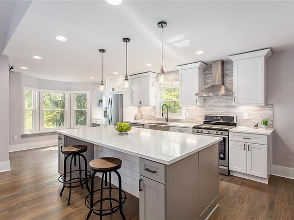 - Kitchen Features: Breakfast Bar, Eat-in Kitchen, View to Family Room, Kitchen Island, Pantry Walk-In, Solid Surface Counters, Tile Counters, Cabinets White, Country Kitchen
