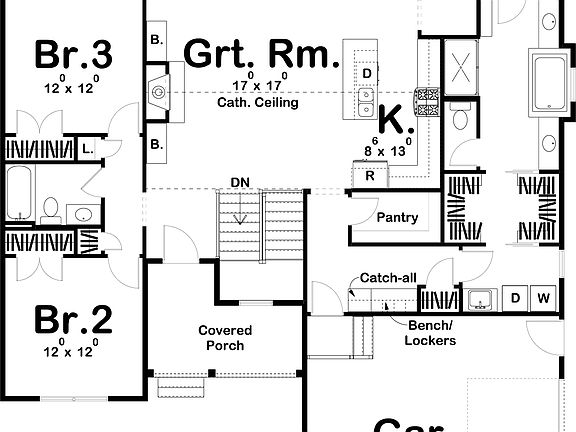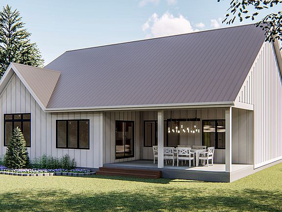 An appealing front porch and board and batten siding gives this 1 story Modern Farmhouse plan unique charm. Inside, guests are welcomed by a cathedral ceiling and a fireplace in the open great room/ kitchen concept. The L-shaped kitchen and island adjoin the dining area, which opens onto a rear covered patio, where guests can mingle before dinner is served. A generously sized master suite is tucked away for privacy behind the kitchen and includes a cathedral ceiling. The well-appointed master bath includes a large whirlpool tub, shower, compartmented toilet and walk-in closet with access to the laundry room. Two additional bedrooms occupy this 1 story house plan, Bedroom 3 offers a birds-eye view of the covered porch outside. This 1 story house plan also features a 2-car side load garage.NOTE: Images may depict landscaping and upgraded fixtures, features, facades or finishes and other items which are not included in the prices stated or not supplied by G.J. Gardner Homes. For availability and pricing of these items please discuss with your new home sales consultant.