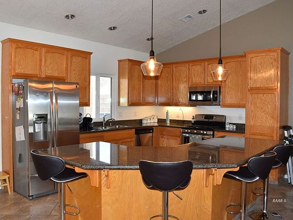 Beautiful home in Southwest Estates. Tiled entry. Living room has tile flooring, vaulted ceiling, lighted ceiling fan, and gas fireplace. Dining room with tile flooring and recessed lighting. Kitchen features tile flooring, granite counters, bar, recessed lighting and pendant lighting. Breakfast nook with tile flooring and chandelier. Two guest bedrooms with newer carpet and lighted ceiling fans. Guest bath has tile flooring, granite counter and tub/shower. Master suite with tile flooring, lighted ceiling fan, walk-in closet and French door. Master bath has tile flooring, granite counter with two sinks and tiled shower. Indoor laundry. Covered patio. Wrought iron gates. RV parking. Whole house water softener system.