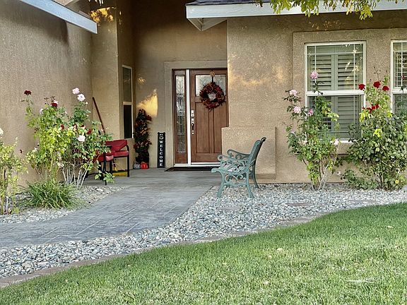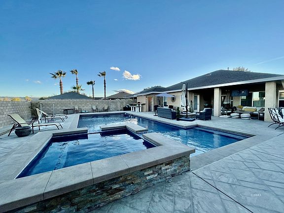 Beautiful curb appeal with this gorgeous pool home in the South West Estates. Open floor plan with large living room, breakfast nook and dining room with shutter blinds, kitchen with recessed lighting, granite counter tops, custom cabinets with pull out shelving, stainless steel appliances and nice size pantry. Inside laundry with extra cabinets, pull out shelving, and granite counter tops. Large master suite with carpeting, recessed lighting, ceiling fan, walk in closet, door going to covered patio, mini split A/C Heater, ensuite bath with tile flooring, tile shower, double sinks, garden tub, natural light and separate toilet area. Both guest rooms have ceiling fans, extra shelving in the closets, carpeting and blinds. Hall bath features granite counters, and tile flooring. Gorgeous backyard with covered tile patio and ceiling fan, heated pool with hot tub and built in fire pit, stamped concrete, 1/2 bath, cemented RV parking, block wall fencing, and wrought iron gates. 2 car garage with insulated door and opener, security system, and owned solar! Schedule your showing today!