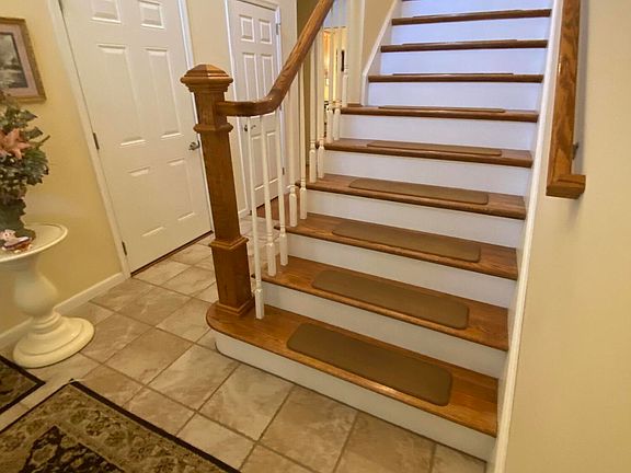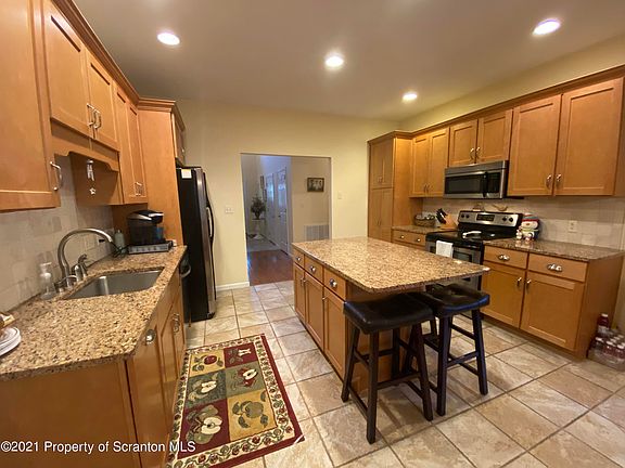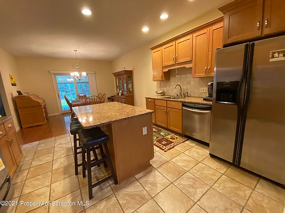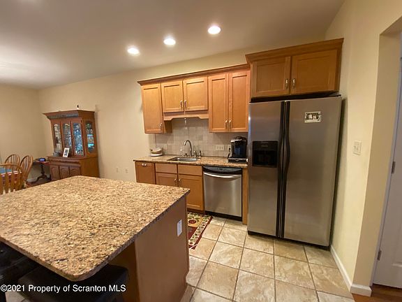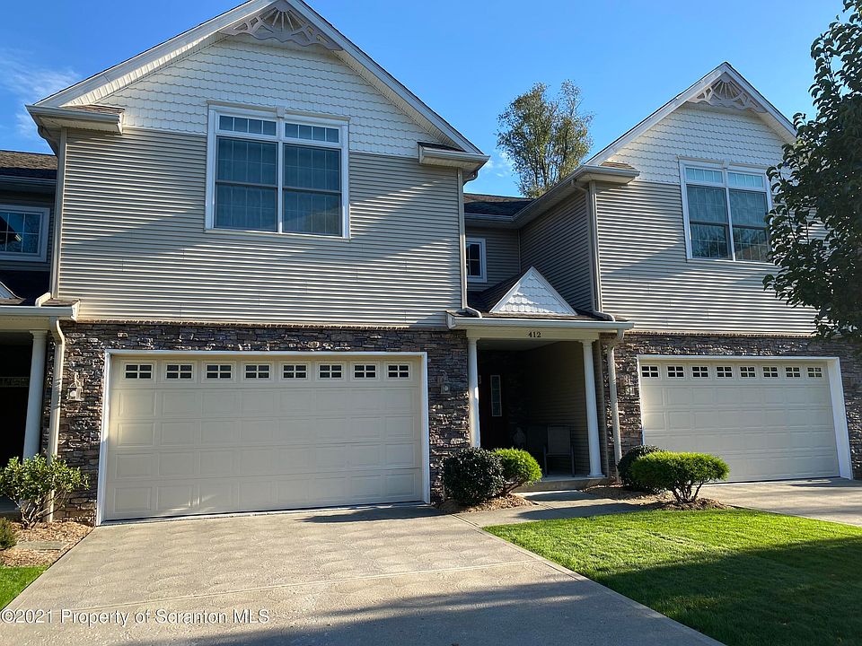 Two story townhouse features open foyer with oak staircase. Custom maple kitchen features granite counters, stainless appliances, center island with seating four four and tile flooring. Living room with oak hardwood flooring and corner, gas fireplace. First floor laundry with storage cabinets, laundry folding table and stationary sink. Master suite with vaulted ceiling, walk-in closet, master bath with jetted garden tub, shower, tile flooring and maple vanity. Two additional bedrooms with great storage space. Full, unfinished basement. Heated, two car garage and concrete driveway. Covered front porch and relaxing, rear patio with awning. Scenic view of the Lackawanna River. Revised flood maps, located in AE zone, does require flood insurance.