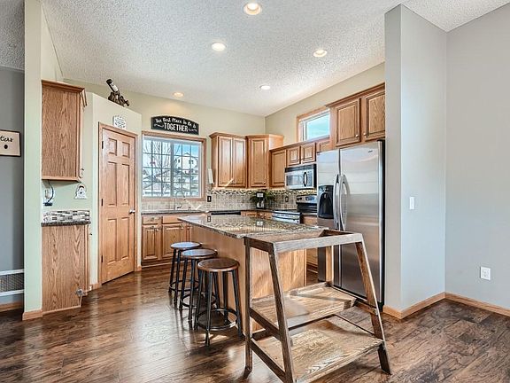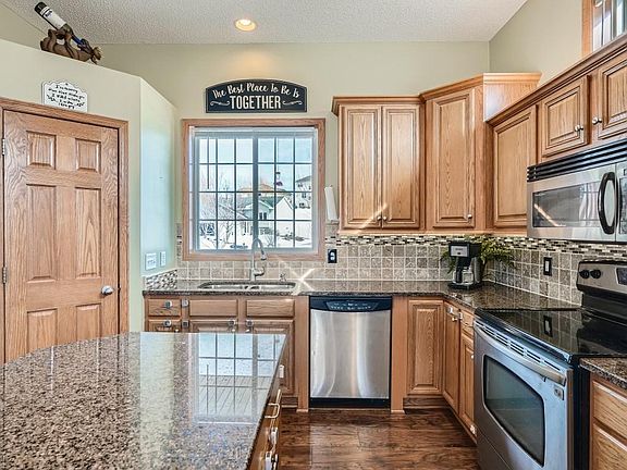 Welcome Home! This stunning two story home is located on a quiet dead-end road backing up to wetlands. Step inside and you are greeted by the beautiful floor to ceiling gas fireplace, gleaming floors and tons of windows with picture perfect views. The large open floor plan is great for entertaining. Updated kitchen with center island, granite countertops, stainless appliance, and walk-in pantry. Dining room leads out to the deck which offers tons of privacy. Four bedrooms on the upper level including a large primary suite with ensuite bathroom. Head down to the fully finished walk-out lower level. You will find a huge family and rec room along with a 1/2 bathroom and tons of additional storage. 3 car heated and insulated garage. Fully fenced in backyard. Sit back and relax on your front porch. This home has it all!