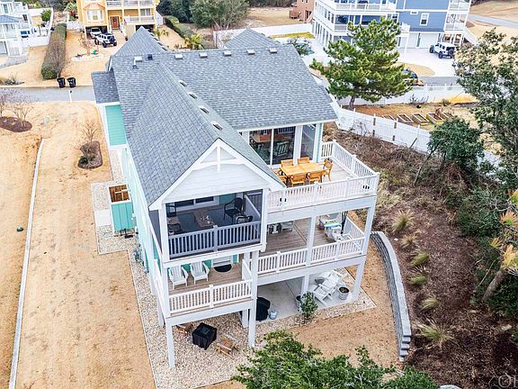 Like-new home with upgraded finishes and quality construction in a fantastic Kitty Hawk neighborhood. This 4 bedroom 3.5 bath home was custom built by Forrest Seal, one of the most reputable builders on the Outer Banks. The design theme was "clean and coastal" and all finishes, fixtures and furnishings were thoughtfully chosen accordingly. The top floor features a dream kitchen with granite countertops (white with subtle blue veining), matching island, tile backsplash and upgraded GE Cafe Series stainless steel appliances. The dining space off the kitchen can easily blend into indoor/outdoor dining via slider doors that open to the screened porch (w/ upgraded screens.) Back inside, the living space is open, with vaulted ceilings and gas fireplace, and it welcomes the outside in with the wall of full length windows and sliders that open to the top level open porch. On the other side of the living space, there is an open sitting room, with 2 walls of windows, perfectly furnished to sit and read or use the telescope to watch the shore birds and the sunrise (windows along the east and south wall are perfect for this!) There is a guest half bath on this level, adorned with coastal wallpaper and nautical light fixtures. Y'all, it is adorable! Down the hall is the primary bedroom with walk in closet and en suite bathroom featuring tile walk-in shower with glass door, double sinks, granite vanity top and purposefully chosen mirrors and light fixtures. There is an office/flex space located in the landing between the top and mid-levels. The mid-level features 3 additional bedrooms, one with en suite bathroom and the other two share a hall bathroom. The laundry space and an additional storage closet are also on this level. The ground level includes a finished flex room that is currently being used as a sitting room, and would make a great game room. It has a door that opens to the backyard patio with grill and chairs. At the main entry, a welcoming front porch greets you and your guests, with covered wraparound decking in that Nags Head style that is so charming. A front door with character opens to the entryway adorned with custom floor tile with sea glass detail. It makes you think of the beach each time you walk through the door. There is elevator access to each level of the home, the elevator floor and custom walls match the interior of the home, literally every detail was considered in constructing and appointing this home. The garage has space for a vehicle plus shelving and additional storage, and provides for a dry entry that opens into a space functioning as a mud room, so you have a place to drop your shoes and jackets ... or towels and flip flops. Natural gas fuels the fireplace, water heater (tankless Rinnai) and gas range, plus the Honeywell GENERATOR that is wired in. It is remotely controlled via a phone app, adding to the ease of maintenance as a 2nd home or primary residence. The owner loved the tranquility and privacy of the trees behind the home, so she opted to keep them in place, but a new owner could choose to remove them to add a pool, as the lot size is large enough to add one. The First Flight Ridge community has its own soundfront pier that owners and their guests can use, the path to access it is right down the street. You will witness some of the most beautiful Outer Banks sunsets over the water from that pier. Or continue along the wide, paved multi-use path that extends for miles along the soundfront and is a great place to walk the dogs or take a morning run. This home is being sold FULLY FURNISHED, including kitchenware, bedding and linens, so literally everything is already done for you. A rental projection is available, as the home's location, space and amenities would make it a fantastic income-producing investment. Or enjoy it full time, as it has details and functionality in place that make it ideal for primary residence living.