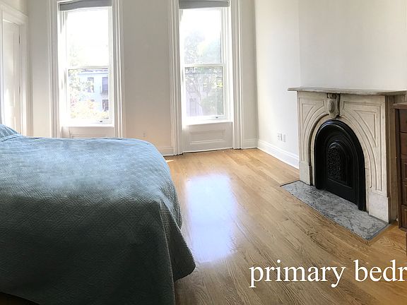 Step into this 1500 square foot sanctuary on the top two floors of a townhouse in north Park Slope. This magnificently renovated home blends new architectural trends with original design elements. Just steps away from the Barclays Center, no detail has been left behind in this stunning duplex unit. The open kitchen features a vented exhaust over the gas range with double ovens, Bosch dishwasher, Liebherr refrigerator, built in microwave and trash compactor. The cabinets are shaker style painted a contemporary gray complemented by the white subway tile backsplash. The large, white island in the kitchen will be the center for entertaining (or the kids' homework) with seating for 5 and built in wine rack. The kitchen is open to both the living room and the dining room, which is brightly lit with two large south facing windows overlooking the treetops of the surrounding gardens. The living room features lovely crown molding, the original marble fireplace and the original pine floors. The two large windows in the living room overlook the street but are surrounded by trees so you feel like you are living in a tree house. Also on this floor is a small room, perfect for a home office, home gym, nursery or small bedroom. There is also a full bathroom and a full sized washer and dryer. The other floor in this duplex unit has two large bedrooms and one small room. The primary bedroom has an ensuite bathroom and a walk-in closet. All closets are fitted with Elfa closet systems that you can adjust to suit your needs. A convenient powder room is also located on this floor. The apartment has central heating and AC, zoned so that you can control each floor. 412 Dean Street is located just a few minutes' walk from the Barclay's Center and the Atlantic terminal with convenient access to the 2,3,4,5,B,D,N,R, and Q subway lines as well as the LIRR for those weekend trips to the Hamptons or easy access to JFK. Prospect Park is just a 15 minute walk away for the fabulous farmers market on Saturdays or weekend trips to the park, Brooklyn Botanic Garden or the Prospect Park Zoo. The location is also close to many restaurants and boutiques along 4th and 5th Avenues. There are two grocery stores nearby, 365 (Whole Foods) and Stop and Shop as well as a Target in the shopping mall in the Atlantic Terminal. Pets will be discussed on a case-by-case basis. All fireplaces are decorative and non-working. Apartment could be available as early as July 20th