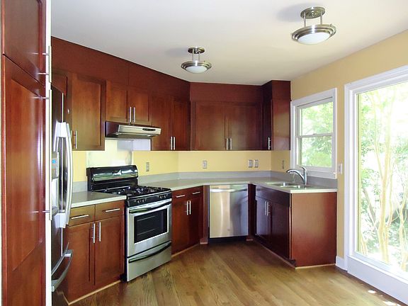 Spacious, sunny European-style townhouse with 3 decks overlooking woodland garden setting with creek. Two stacked stone fireplaces, hardwood and bamboo flooring. Many more features, including kitchenette on ground floor, jetted tub in master bath, new roof, new gutters, recent exterior paint, bike barn, and stainless steel appliances.
