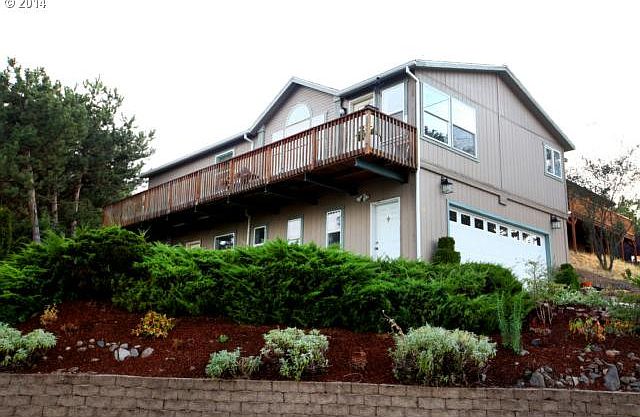Sweeping views of the Columbia River and Mt. Hood from private deck and dining room. 3 bed, 3 full bath. Open layout upstairs with Master Suite. Separate living quarters down with kitchenette, bath. Energy Efficient Construction, tankless water heater, heat pump for A/C and heat. Manufactured then set on full one story foundation. Blocks to Columbia Gorge College and Sorosis Park. Take advantage of Dalles economic boom and expansion!