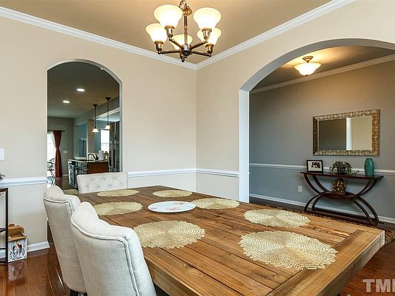 Beautiful North-East facing home with lots of upgrades! 5 Bedrooms, Loft, & 4 Full Bath. Guest suite on the main floor! Hardwood all main level;  Granite counter tops, Kitchen Island bar w/ pendant lights, b/ splash, S/ steel appliances. Fireplace in Family room. Extnded Master bedroom with trey ceiling. MBR sitting area. Custom walk in closet & Ceiling fan Master. Custom closet in 2nd BR. All-season room at the back. Community pool. Close to RTP, RDU, 40 & 540! Walking distance to Cedar Fork Elementary!
