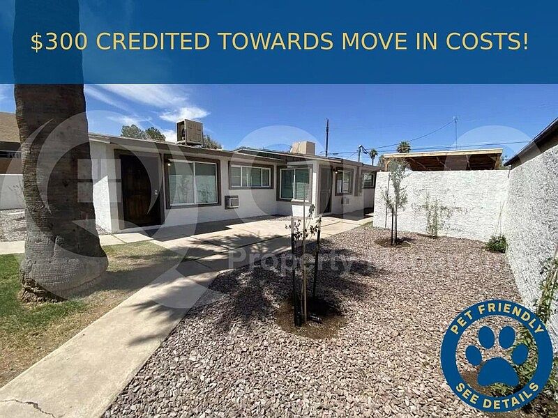 ** $300 CREDITED TOWARDS MOVE IN COSTS! ** Available Now! 817 SQ FT! 2 bedroom, 1 bath apartment in Phoenix! Nicely updated single-story corner unit with an open-concept living/dining area. The charming kitchen features ample cabinetry and countertop space. Both bedrooms are nicely sized, and there's a full bath. Enjoy a front patio and back porch. Full-size washer and dryer included! Additional storage space and gated covered parking spot. Located on a residential street with ample guest parking! **Water/Sewer/Trash Included For $50 Monthly RUBS **A Minimum Credit Score Of 620, 2 Years Of Rental History, and Income Of 3x Monthly Rent Is Required To Qualify For This Unit APPLICATION: $65 Application Fee Per Applicant 18 years or older (Nonrefundable). Please allow 24 to 72 business hours to process the Application once all required documents are submitted by all applicants 18 years or older. LEASE LENGTH: 12-month Minimum (Longer Lease Term may be negotiable) INITIAL MOVE-IN COSTS: Upon application approval, a nonrefundable Holding Retainer will be required to secure the property and will be applied towards the move-in costs. The Holding Retainer amount is determined by the type of Security Deposit option you choose. Applicants can choose between a traditional Security Deposit which may be 1 times the monthly rent but not greater than 1.5 times the monthly rent (75% refundable) or a Security Deposit Alternative program. A $250 one-time lease preparation fee as well as the first month's rent is due prior to move-in. Pet Policy: Dogs and Cats Allowed with the following exceptions: Up to 2 pets MAX will be considered for this home! (11-50 lbs) If the Applicant has a Pet, $150 Non-Refundable Pet Fee per pet. A $35 Pet Rent per month per pet will be added to the rental amount (this fee does not apply to assistive animals). RECURRING MONTHLY COSTS: There is a 4.9% Rental Tax/Administration Fee. (AZ Dept of Revenue Transaction Privilege Tax ends December 31, 2024) If the Applicant has a Pet, a $150 Pet Rent Per Pet (Does Not Apply to Assistive Animals). All On Q Property Management Residents are enrolled in the Resident Benefits Package for $39 or $49 with pets, which includes liability insurance, credit building to help boost the resident's credit score with timely rent payments, move-in concierge service making utility connection and home service setup a breeze during your move-in, Renter to Buyer program, and much more! *Other terms and conditions may apply. All information including advertised rent and other charges are deemed reliable but not guaranteed and is subject to change.