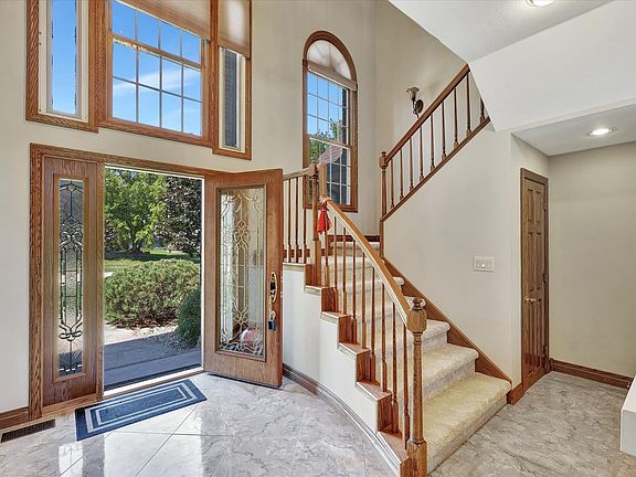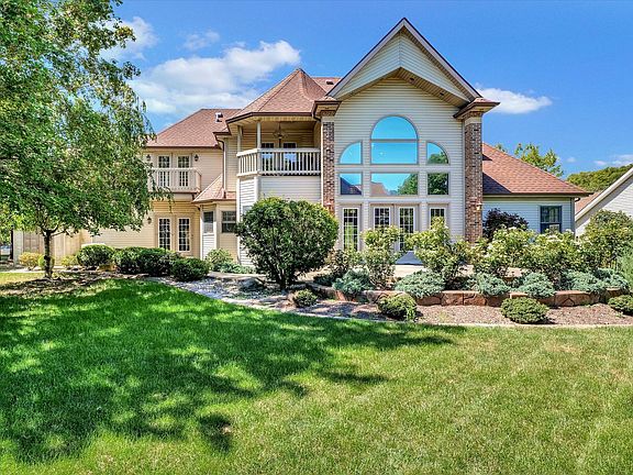 PRICE ADJUSTMENT at 412 N Abbey Rd.! A captivating residence nestled in the welcoming Beringer Commons community. Step inside, and you'll be greeted by grandeur: soaring ceilings grace both the foyer and living room, adorned with an impressive wall of windows that flood the space with natural light. A captivating two-way fireplace and architectural accents make this home truly unique. With four bedrooms, including a large master suite on the first floor (boasting an expansive master bath and huge walk-in closet with custom built-ins!), and three bedrooms upstairs. Notably, one of the bedrooms has a private covered balcony with views of the back yard and lake. Spacious gourmet kitchen, featuring abundant cabinets, a center island, granite countertops, wall oven and microwave, a walk-in pantry, lovely eating nook and a multitude professionally cleaned windows. Other highlights include dual staircases, a dedicated computer area, an upstairs family room, solid oak doors and trim, trey ceiling in dining room and master bedroom, a generously sized laundry room loaded with cabinets for storage, a central vacuum system, and the added comfort of a NEW ROOF and FURNACE installed in 2021. The 3.5 car garage boasting heating and cooling with a separate furnace and A/C along with an abundance of storage space. The professionally landscaped yard showcases a variety of trees and shrubs and private, fenced-in back yard. Located minutes to U of I Campus, hospitals, shopping and a Stone Creek golf course. A home you will not want to miss!