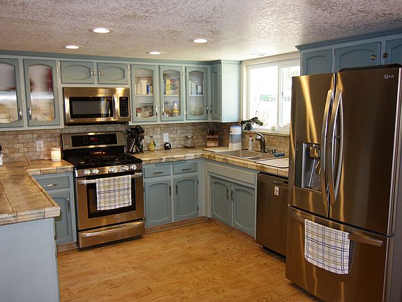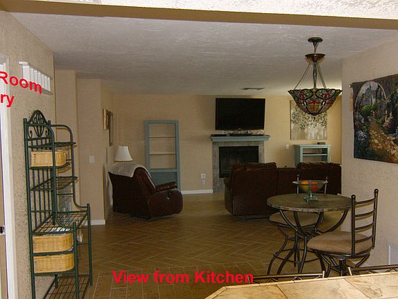 Front yard has rose garden & easy care gravel!! Privacy gate opens to cozy tiled sitting area. Inside the house, the floors are all porcelain tile herring bone pattern for easy cleaning! .Fireplace is energy efficient:: use with gas or wood burning. NO popcorn on these ceilings! .Amazing custom kitchen with lots of space, cupboards, refrigerator, and tiled counters. Laundry room near by with washer & dryer. Spacious dining room has french doors to covered patio. Three bedrooms! Master bedroom has private bathroom and large closet. Lots of space in back yard for gardening! Eave mount evaporative cooler.. Large 2 car garage w/automatic roll up door.!!!