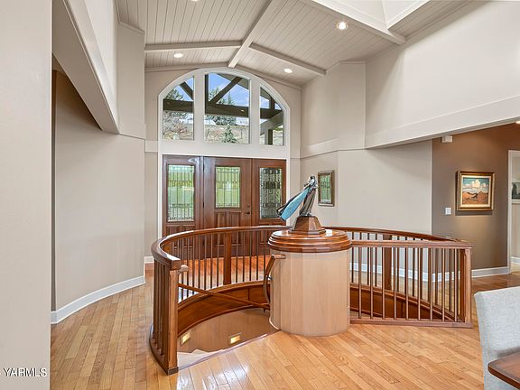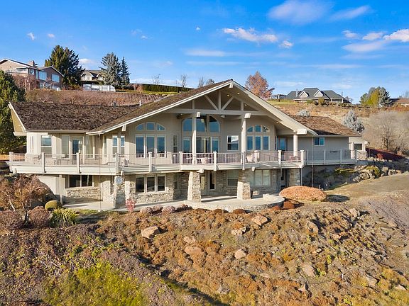 Indulge in the epitome of hilltop living in the heart of West Valley with this exquisite 2.35-acre oasis. A paved driveway guides you to a meticulously designed residence, where luxury, privacy, and awe-inspiring views converge seamlessly.Upon entry, the wood ceilings and grand spiral staircase capture your attention, setting the tone for the home's elegance. The expansive open-concept main level, featuring a living space, dining area, and kitchen, invites you to relax and entertain. Natural light pours through large arched windows and a ceiling skylight, creating a bright and inviting ambiance. Nearly every room offers panoramic views! The primary suite is nestled on the west end of the main level where you'll have direct deck access, a full bathroom and walk in closest. The main also features a large office with built in desk, and a large utility room with pantry space.Ascend the grand spiral staircase to discover an additional living space, 3 bedrooms, storage rooms, and a wine cellar--a retreat for wine enthusiasts. Multiple utility/storage rooms maximize the home's practicality, ensuring optimal convenience. Walk out onto the expansive stone patio and take in the valley views.Off the main floor step outside onto the wrap-around deck, an entertainer's haven with ample space for gatherings, serene evenings, and appreciation of the hilltop serenity. The property is adorned with striking stacked stone pillars, adding architectural flair to the landscape. An extra large 2 car attached garage and an additional 2-car detached garage provide ample space for your vehicles and toy storage needsThis is a rare opportunity to own a slice of West Valley's premier real estate. Don't miss your chance to call this hilltop haven your own.