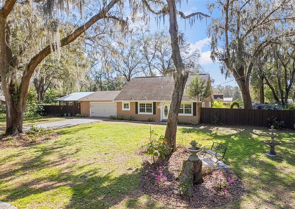 Your own private oasis awaits you with this unique and charming, move-in ready home situated on a fenced acre. The park-like setting provides nature's beauty and privacy, and the location provides easy access to all the amenities the area has to offer. Adding to the feeling of privacy, the home is set back from the main road and accessed by private easement. This home offers a large and inviting living room, an open and spacious eat-in kitchen with granite counters, wood cabinets and plenty of storage. Two large bedrooms and bathroom downstairs, with a large bonus room and bathroom upstairs that could be a perfect owners' retreat. The third bathroom is located in the garage and serves as a pool bathroom. At the back of this charming home is an additional, expansive bonus room currently used as a family room and ideal for entertaining family and friends, with access to the pool and brand new sliders leading to the back yard. Enjoy the Florida weather in the large recently screened (2021), inground vinyl pool, with a spacious covered area. The pool liner was replaced in 2021 and the pool filter system was replaced in 2022. The back yard is a gardener's dream with butterfly garden, raised garden beds, peach, navel orange, lime, Myer's lemon, guava and self-pollinating avocado trees. There's even a chicken coop with enclosed run, and egg producing chickens as well. The backyard irrigation system was added in 2021. There are 2 AC units and the main AC unit was replaced in 2021. In addition to all this lovely home has to offer, there is a very large and spacious, 2-story out building with attached covered/carport area. Currently used as a workshop and storage, this space can be used for your home business, hobbies or any toys you may have....too many possibilities to list. Conveniently located to shopping, restaurants and more.