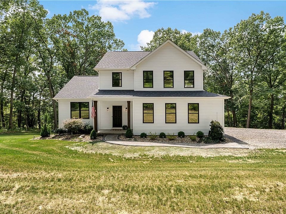 This stunning 2023 new construction home is nestled on 6.44 acres of lush, wooded surroundings, offering a peaceful, nature-inspired lifestyle. With roughly 2,525 sqft. of living space, this residence features 3 spacious bedrooms and 2.5 bathrooms. The inviting interior boasts abundant natural light, an open layout, and a cozy fireplace in the living area. The modern kitchen is equipped with sleek black stainless appliances and quartz countertops. The primary suite and additional bedrooms provide ample comfort, while the bathrooms offer a spa-like retreat. The exterior seamlessly blends with the green surroundings and includes a spacious deck, a covered stamped concrete patio, and fully landscaped yard with walkways leading you to easy outdoor living. This home is perfect for those seeking tranquility and thoughtful design. Don’t miss this rare opportunity to own a beautifully crafted home in a serene setting! Home warranty included.