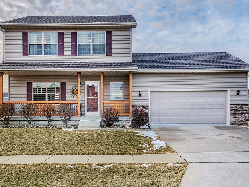 This Hubbell Homes Two-Story is a One Owner Special! This Grimes home is close to everything and has easy access to Highway 141 for a quick commute to anywhere in the metro. The curb appeal on this home is awesome with well kept landscaping and a covered porch your neighbors will be jealous! The entry way features lots of natural light and is open to the entire main floor. Granite countertops in the kitchen flow well into the dining room. Just off the dining room is a gorgeous deck that leads out to the fenced in backyard, which is great for the kids or pets! The home has three bedrooms on the second level, all spacious with great closets and two full baths. This maintenance free home will go fast!