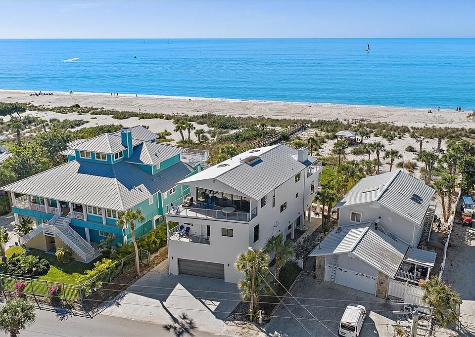 Wake up every morning to beautiful Gulf views from your third floor primary suite! Experience effortless luxury in this exceptional Gulf-front estate on the pristine shores of Casey Key, where privacy, tranquility, and sweeping water views await. Originally built in 1951 and tastefully renovated in 2016 and 2025, this beach-front residence seamlessly blends classic character with refined modern updates. Offering nearly 4,000 square feet of living space under air, this home features 6 bedrooms and 4.5 bathrooms across three levels, designed for both comfort and entertaining. Generous room for hosting/gathering throughout with three expansive balconies inviting you to enjoy both breathtaking Gulf and intracoastal waterway views! Thoughtfully designed in-law quarters on the first level with the second level featuring a gourmet chef’s kitchen, family room and additional guest rooms/baths. The chef's kitchen is equipped with a Wolf six-burner gas range with griddle and double oven, a Sub-Zero PRO refrigerator/freezer, granite countertops, soft-close cabinetry, and a large centerpiece island perfect for casual dining with a view. The Owner's level on the third floor is to die for! Tremendous views of the Gulf from the substantial primary suite with this level also featuring a sitting area and den/office/bonus room that has views of the intracoastal waterway! The primary bathroom includes a stand-alone garden tub with skylight over, large walk-in glass and tile shower, dual vanities, and solid wood cabinets with granite countertops. Additional highlights include impact windows and doors, travertine flooring throughout (with the exception of engineered hardwood in the kitchen), marble-tiled baths, and a 2-car garage. Recent improvements include a new metal roof (2025), new sod/landscaping/irrigation (2025), fresh paint inside and out (2025), a new septic system (2025) and A/C system (2023), offering peace of mind for years to come. Offered turnkey furnished. With private beach access steps away, this is a rare opportunity to own a truly remarkable waterfront retreat on one of Florida’s most desirable barrier islands! Call today for more information or to set up a private tour!