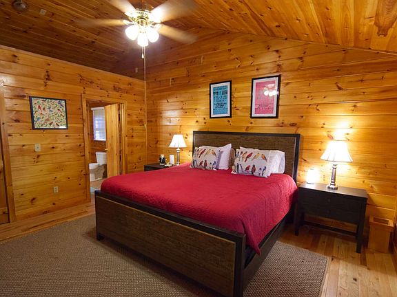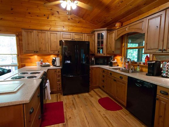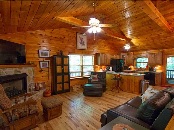 Charming cabin conveniently located close to town yet private and quiet. Spacious Master with walk in closet and laundry on the main. Screened in back porch off kitchen and dining area. Open plan with fireplace and hearth. Kitchen features solid surface countertops, custom cabinets, plus stainless appliances already ordered. Downstairs, features second living room, two bedrooms, bath and storage. Circle drive and large lot. This one won't last long. Call for an appointment today.