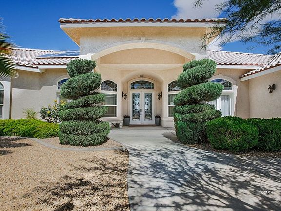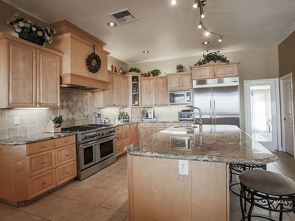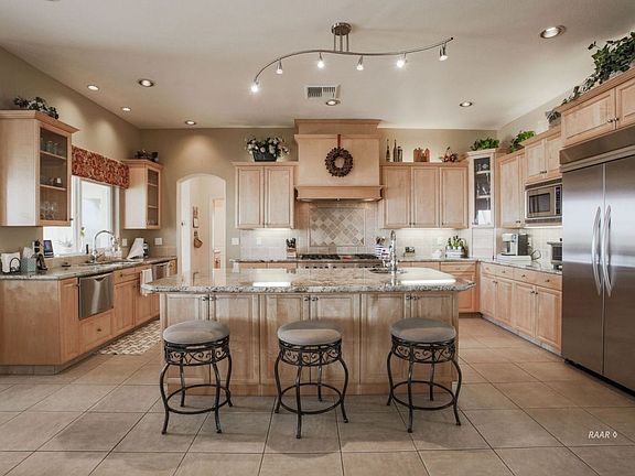 Breathtaking 270 degree views! Mediterranean-inspired, custom designed 4142 sq foot home situated on a ½ acre cul-de-sac lot in College Heights. Eight-foot glass front doors lead you through a stunning entrance that flows into the massive Great Room with wood-burning fireplace, high ceilings, and a custom bar with granite countertops and two wine fridges. The spacious den is flanked with 8-foot glass doors and a 12-foot ceiling. The formal dining room, with an impressive 12-foot ceiling, opens onto a front patio and is large enough to seat 10. The chef's kitchen with granite countertops, six-burner two-oven range, 48" built-in refrigerator, two slide-out dishwasher drawers, and a massive 4'x8' island. 5 bedrooms each with its own en-suite bathroom. Main hallway with half bath for guests. Master bedroom with sitting room, gas fireplace, and private patio. Master bath features jetted tub and large shower with two shower heads as well as an oversized walk-in-closet. Covered patio with tile floor and large built-in BBQ island. Sparkling salt water pool with waterfalls and automatic cover. 45 solar panels have eliminated electric bills. Refrigerated air and RV access! Must See!