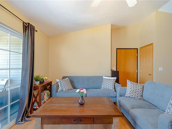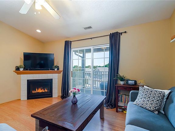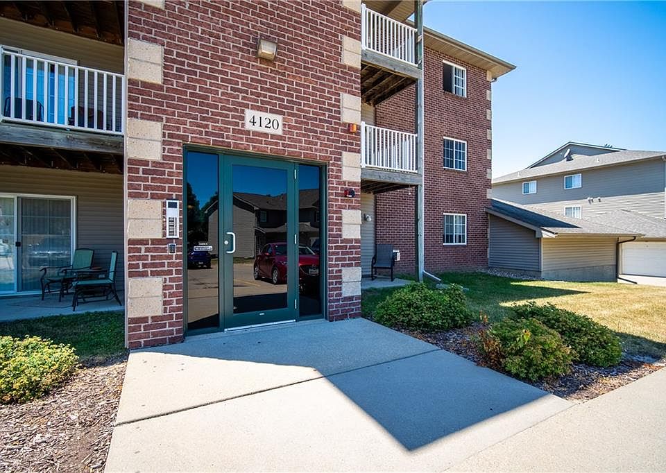 Excellent brick front exterior, 3rd floor condo with vaulted ceilings and sliding doors out to a private eastern facing covered balcony ! Built in 2003, this 902 square foot 2 bedroom, 2 bath, 1 car detached garage unit is open concept entry, kitchen and living room. Large living space with gas corner fireplace. Two spacious bedrooms with walk- in closets ( one with private bath). Hard surface flooring throughout the unit. Large kitchen with a breakfast bar. Lots of cabinet and counter space pantry and in unit laundry are conveniently located right off of kitchen . Kitchen appliances stay, newer stove and dishwasher. Home features a master bedroom with an en suite bathroom, a 2nd bedroom with a large walk-in closet and another full bath . 1 car detached garage with opener. Secure building. Beautiful stocked community pond located just behind the building for fishing and summer walks! Close to shopping , parks, bike trails, restaurants, easy access to I-80/35