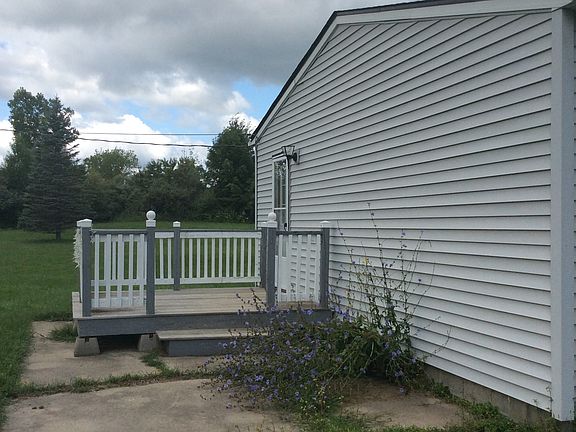 This is a Bank owned house. Three bedrooms one and one half bath, living room and kitchen. There is a small porch on the front and a deck off the side of the kitchen. There is a large garage/pole shed that has a garage door in the front and a second room and garage door off the back. There is also a stand alone shed behind the pole shed. A very nice piece of property in a quiet neighborhood.
